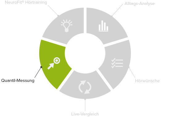 Nachdem wir gemeinsam eine Hörgeräte-Einstellung erarbeitet haben, mit der Sie zufrieden sind, wenden wir erneut eine Quantilmessung an. Diesmal wollen wir herausfinden, ob wir Ihre individuellen 100% bereits erreicht haben. Wenn nicht, ermitteln wir die Differenz zu Ihrem Maximalwert des Verstehens. Solche Differenzen können entstehen, wenn die Hörprobleme schon längere Zeit bestehen und eine Entwöhnung vom Hören eingetreten ist. Auch dann können wir unser Ziel erreichen, wir müssen uns nur ein wenig mehr Zeit nehmen.
